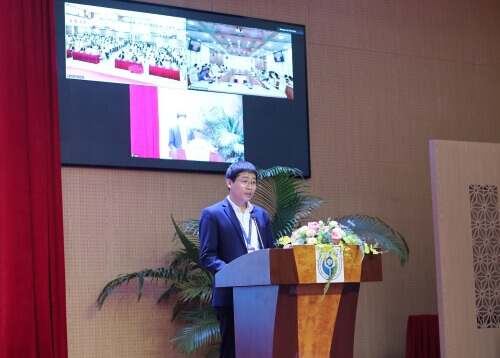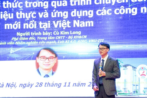 TS. Cù Kim Long, Phó GĐ Trung tâm CNTT của Bộ Khoa học Công nghệ báo cáo tham luận về nội dung "Một số thách thức lớn trong quá trình chuyển đổi số từ góc độ dữ liệu thực và ứng dụng các công nghệ mới nổi tại Việt Nam"