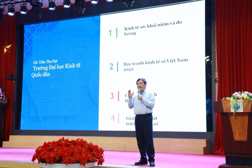 GS.TS Trần Thọ Đạt - Nguyên Hiệu trưởng, nguyên Chủ tịch Hội đồng trường, Chủ tịch Hội đồng Khoa học đào tạo, trường Đại học Kinh tế quốc dân lên trình bày báo cáo tham luận "Khái quát các vấn đề về kinh tế số" (khái niệm và đo lường, phân tích bức tranh tổng thể về kinh tế số VN năm 2022, từ đó đặt ra các vấn đề về cơ hội, thách thức và giải pháp phát triển kinh tế số).
