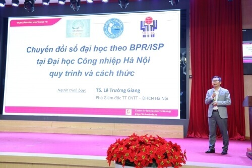 TS Lê Trường Giang - Phó GĐ Trung tâm CNTT, ĐH Công nghiệp Hà Nội báo cáo tham luận về "Chuyển đổi số đại học theo BRP/ISP tại ĐH Công nghiệp HN, quy trình và cách thức"