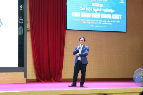 Ông Vũ Đức Thuận, Giám đốc vận hành, Công ty TNHH VTI Education một chuyên gia CNTT, đã có hơn 18 năm kinh nghiệm làm việc trong ngành, hơn 9 năm trong lĩnh vực đào tạo và phát triển chương trình về IT đã giúp các em sinh viên hiểu hơn về lộ trình theo đuổi ngành CNTT. Thông qua bài tham luận ông đã giúp sinh viên IT phát huy được thế mạnh bản thân, chuẩn bi tốt nhất về kiến thức chuyên môn trước khi tham gia thực tập.