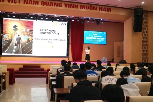Trong chương trình, các sinh viên được lắng nghe những chia sẻ rất tâm huyết của Bà Trần Thị Linh, Giám đốc vận hành, Công ty Devwork. Bà đã chia sẻ giúp sinh viên IT chuẩn bị tốt nhất khi tham gia phỏng vấn trước nhà tuyển dụng. Một số mẹo nhỏ ghi điểm khi gặp nhà tuyển dụng.