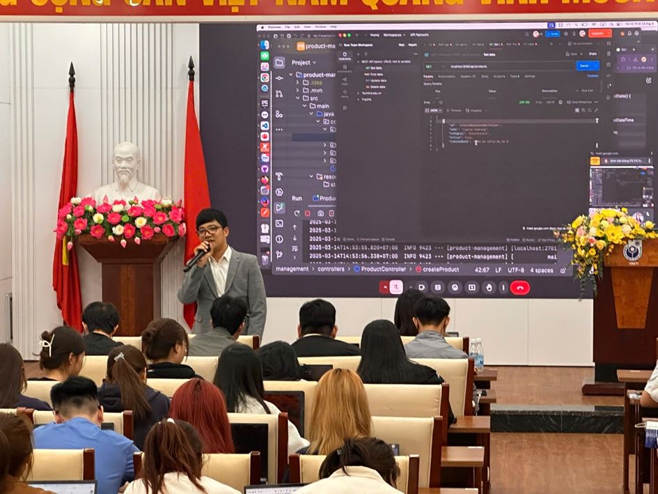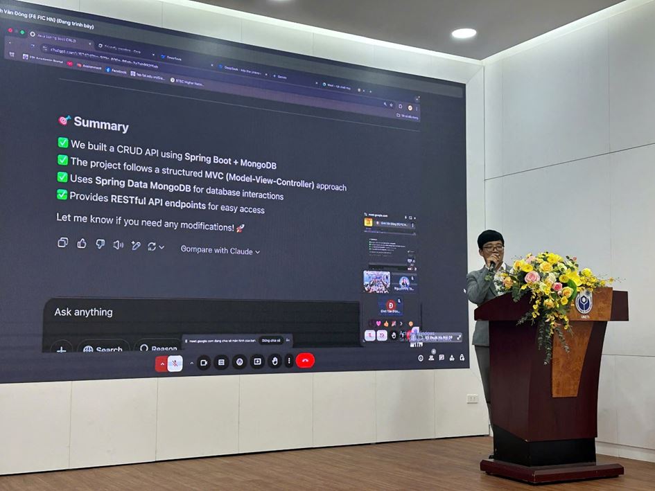 Hội thảo đã mang đến những góc nhìn hữu ích về ứng dụng AI trong lập trình, giúp lập trình viên không chỉ làm việc hiệu quả hơn mà còn sáng tạo hơn. AI không phải là công cụ thay thế con người mà là một "trợ lý thông minh", giúp chúng ta tập trung vào những nhiệm vụ có giá trị cao hơn. Trong tương lai, AI sẽ tiếp tục đóng vai trò quan trọng trong sự phát triển của ngành công nghệ phần mềm, mở ra nhiều cơ hội mới cho lập trình viên và doanh nghiệp. Trong suốt hội thảo, Thầy Cô giảng viên và các bạn sinh viên đã rất hào hứng khi được lắng nghe những chia sẻ về nhiều kiến thức mới. Hi vọng những kiến thức này sẽ là hành trang để các bạn sinh viên vững vàng nắm lấy cơ hội trong tương lai.